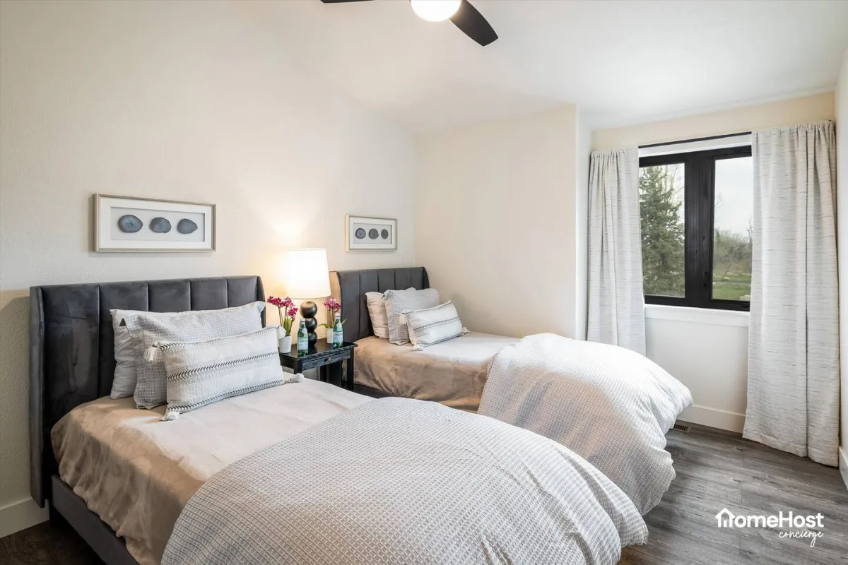 Shared room with two single beds and shared bathroom.